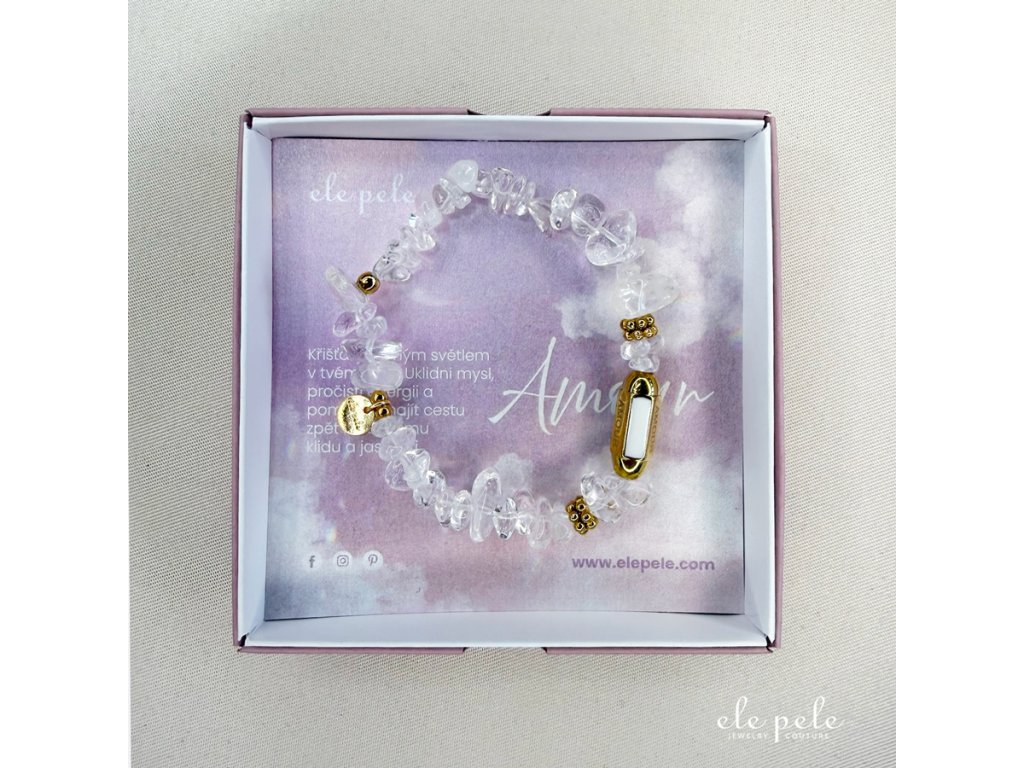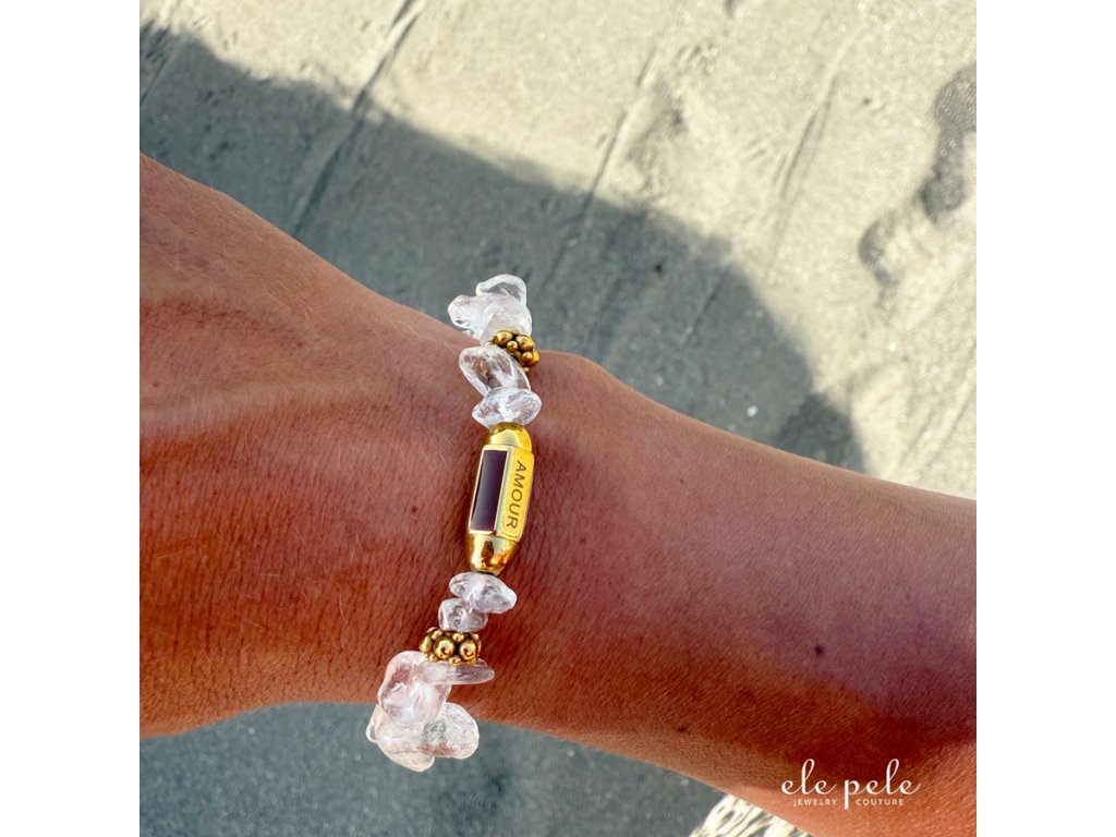 Náramek AMOUR je vyroben ze sekaných minerálních kamenů křišťálu, které září přirozenou čistotou a jemnou silou. Každý kousek je doplněn o komponenty z chirurgické oceli, pozlacené logo Ele Pele a detail s nápisem Amour – symbolem lásky ve všech jejích podobách. 💫