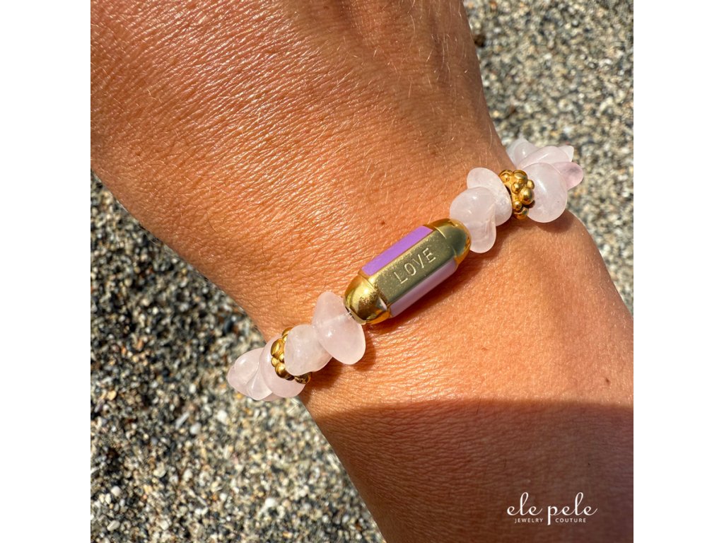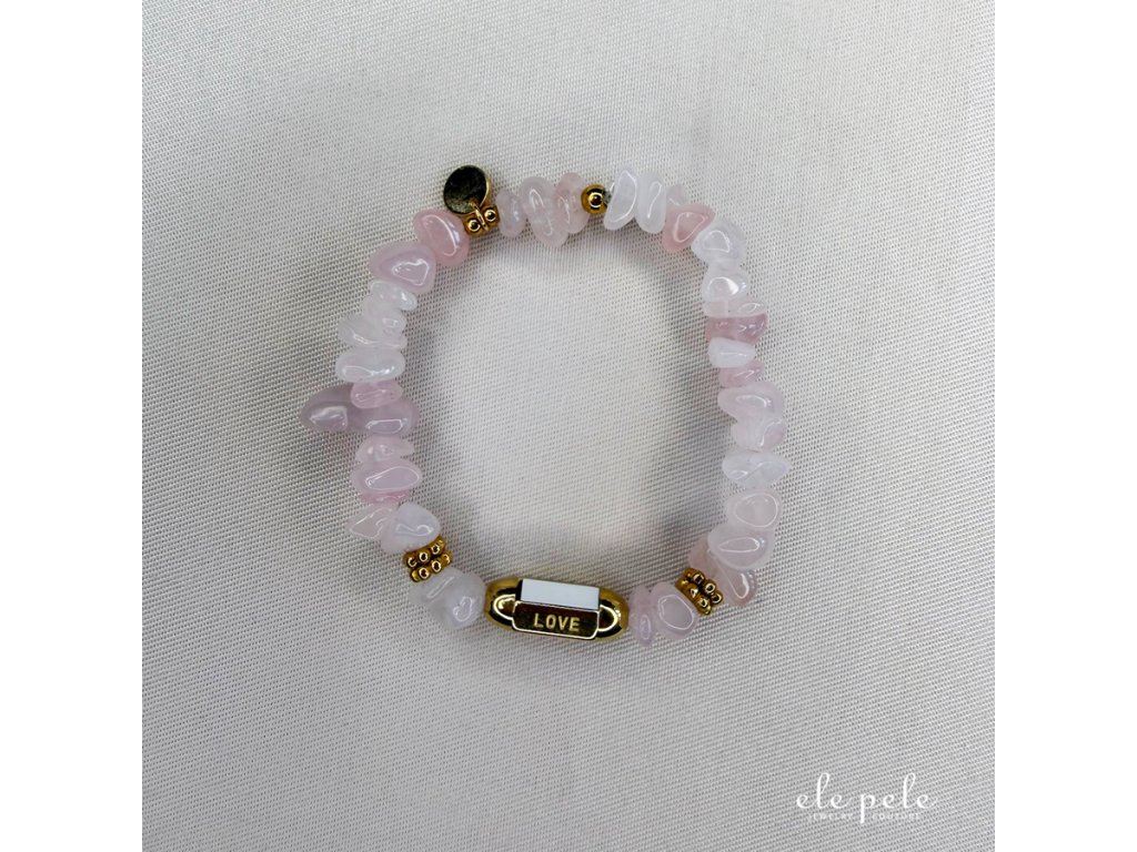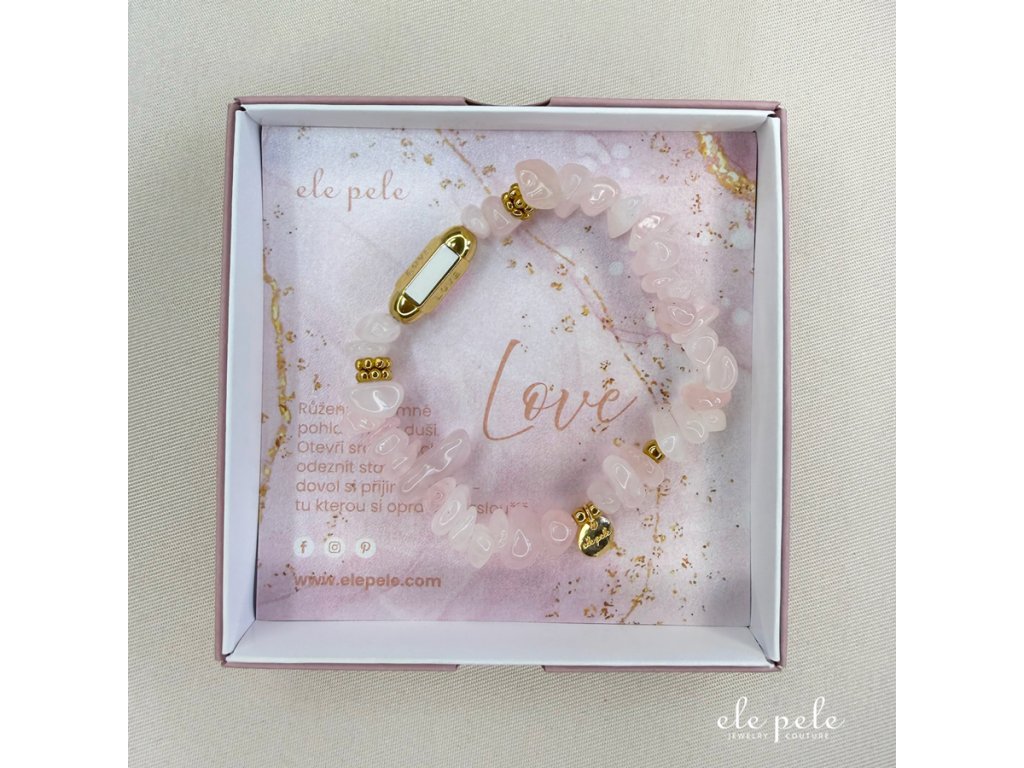 Náramek LOVE je vyroben ze sekaných minerálních kamenů růženínu, které vyzařují něhu, harmonii a jemnou ženskou energii. Každý kousek je doplněn o komponenty z chirurgické oceli, pozlacené logo Ele Pele a detail s nápisem Love– symbolem srdce otevřeného životu a lásce. 💫